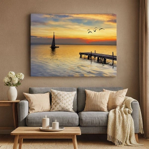 Imprimeul pe pânză „Seara se întoarce” este o decorațiune unică ce ne transportă într-o lume a păcii și liniștii. Înfățișează un apus de soare pitoresc peste un lac calm, unde o barcă cu pânze plutește leneș pe apă. În prim-plan se află un debarcader din lemn, care pare să ne invite să ne relaxăm și să contemplăm priveliștea. Păsările plutesc deasupra apei, iar culorile calde ale cerului se împletesc cu reflexiile de pe suprafața lacului.