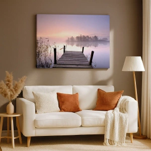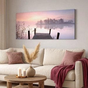Tablou pe pânză Canvas - Un dig pe malul lacului în zori, cu ceață și un cer pastelat - 70x50cm - Din ceața de liliac... - Decorațiune modernă pentru perete pentru living și dormitor ARTTOR
