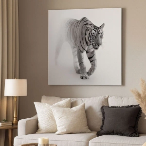 - Pictura înfățișează un tigru maiestuos ieșind din ceață, în tonuri subtile de alb și negru. Este completarea perfectă pentru interioarele care celebrează sălbăticia și eleganța naturii.