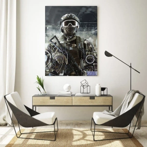 Tablou pe sticlă - Un soldat în echipament tactic pe fundalul unei interfețe futuriste. - 70x50cm - Putere la putere - Decorațiune modernă pentru perete pentru living și dormitor ARTTOR
