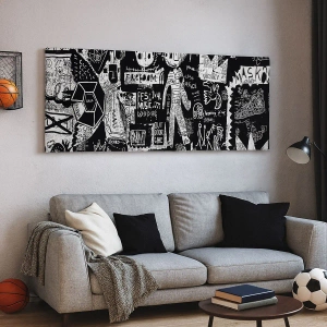 - Această imprimare pe pânză de 70x50 cm prezintă un colaj alb-negru inspirat de arta stradală urbană. Perfectă pentru interioare moderne și expresive.