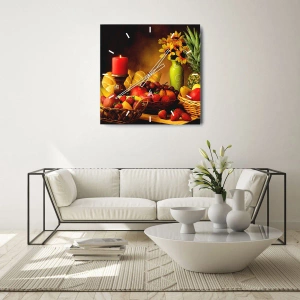 Ceas de perete - Ceas pe sticlă - Un coș cu fructe, pâine și floarea-soarelui pe masă - 30x30cm - Natură moarte cu pâine și fructe - Decorațiune modernă pentru perete pentru living, bucătărie și dormitor ARTTOR