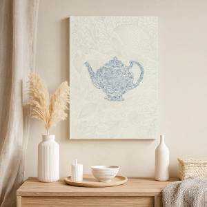- Pictura înfățișează un ceainic ornamentat cu ornamente albastre, pe un fundal cu model delicat. Perfect ca decorațiune pentru bucătărie sau sufragerie, adaugă eleganță și farmec vintage oricărui interior.