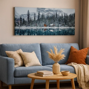 - Un peisaj de iarnă cu cabane în pădure cu vedere la un lac înghețat. O decorațiune perfectă pentru a aduce pace și frumusețe naturală oricărui interior.