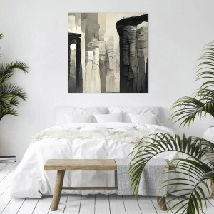 Compoziția picturii prezintă coloane maiestuoase care simbolizează forța, stabilitatea și atemporalitatea. Nuanțele de gri și negru accentuează textura pietrei, conferind picturii profunzime și sofisticare. Lumina și umbrele subtile creează o atmosferă armonioasă care aduce pace oricărui interior.