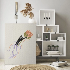 Tablou pe sticlă - O mână stilizată cu un buchet de flori desenate cu linii pastelate. - 70x50cm - Atingere surorială - Decorațiune modernă pentru perete pentru living și dormitor ARTTOR