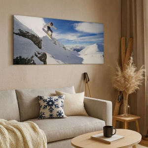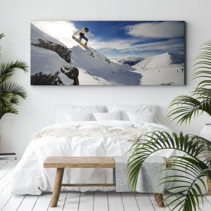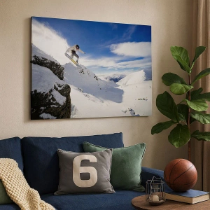 Tabloul pe pânză „Snowboarder sărind de pe o stâncă pe fundalul munților acoperiți de zăpadă” înfățișează un snowboarder în acțiune, sărind de pe o stâncă pe fundalul unor munți pitorești, acoperiți de zăpadă. Scena plină de dinamism și emoție subliniază pasiunea pentru sporturi extreme și aventuri în peisaje montane.