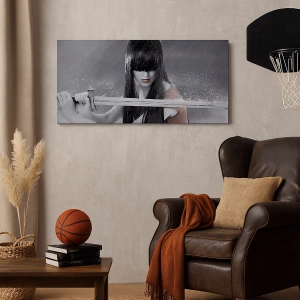 Fiecare detaliu, de la picăturile de ploaie la lama sabiei, a fost reprodus cu precizie, creând efectul unei scene realiste. Motivul unei femei cu o sabie simbolizează puterea, curajul și determinarea, perfect potrivit pentru interioarele contemporane.