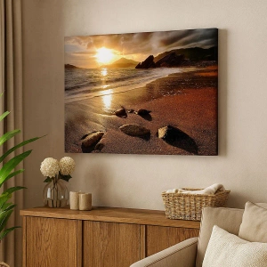 Tablou pe pânză Canvas - Plajă la apus cu pietre pe țărm - 70x50cm - Urmează soarele spre dealuri - Decorațiune modernă pentru perete pentru living și dormitor ARTTOR