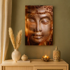- Pictura înfățișează o statuie a lui Buddha înconjurată de flăcări aurii. Este un motiv ideal pentru interioare inspirate de Orient și armonie spirituală.