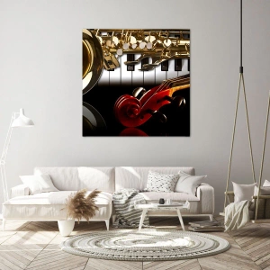 - O compoziție cu instrumente muzicale: un saxofon auriu, clape de pian albe și negre și o vioară roșie. Perfectă pentru interioare dedicate muzicii și artei.