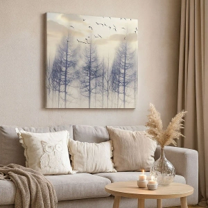 - Această pictură subtilă înfățișează o pădure învăluită în ceață, cu siluete de păsări pe un cer plin de nuanțe calde de apus. Este decorațiunea perfectă pentru a aduce armonie și liniște oricărui interior.