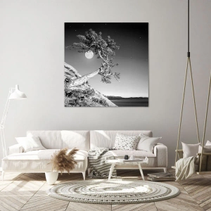 Tabloul Copac sub Lună este o compoziție unică în culori alb-negru care înfățișează un copac singuratic pe o stâncă în lumina lunii. Detaliile copacului, textura stâncii și tranzițiile tonale subtile subliniază armonia și frumusețea naturii. Întreaga piesă este menținută într-un stil minimalist care se potrivește perfect în interioarele moderne.