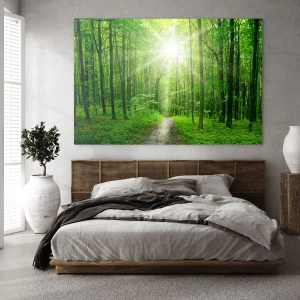 Tablou pe sticlă - O cărare în pădure luminată de razele soarelui - 70x50cm - Catedrala verde - Decorațiune modernă pentru perete pentru living și dormitor ARTTOR