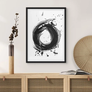 Poster în ramă neagră - Cerc abstract alb-negru cu pete dinamice - 50x70cm - Vortexul creației - Decorațiune modernă pentru perete pentru living și dormitor ARTTOR