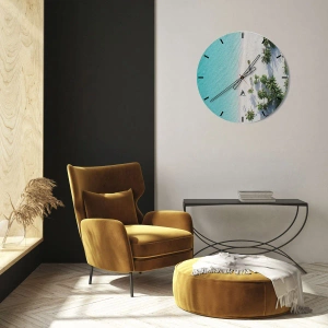 - Acest ceas înfățișează o vedere de sus a unei plaje exotice cu apă turcoaz și palmieri. Perfect pentru iubitorii de peisaje de vacanță, forma rotundă a ceasului se potrivește cu o varietate de interioare.