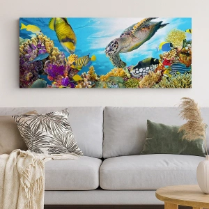 - Această pictură înfățișează o lume subacvatică plină de pești colorați, recife de corali și o broască țestoasă maiestuoasă. Cufundă-te într-un decor tropical care aduce pace și armonie oricărui interior.