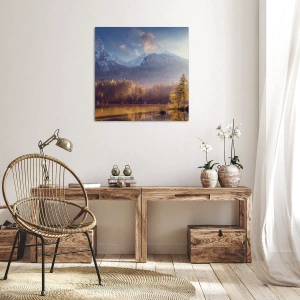 Tablou de perete - În munți și văi - O vedere pitorească a unei păduri montane și a unui lac în zori