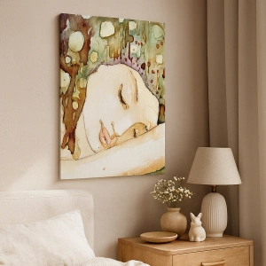 Punctul central al tabloului este figura unei femei înfățișată în tehnica acuarelei. Ochii ei închiși și poza calmă accentuează starea de spirit de liniște și introspecție. Formele abstracte din jur, în nuanțe de verde și violet, conferă compoziției profunzime și mister, creând o atmosferă visătoare, aproape eterică.