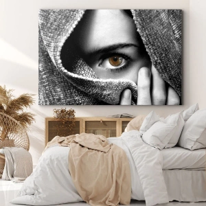 Tabloul pe pânză „Descoperă misterul” înfățișează un portret intrigant al unei femei cu ochi de chihlimbar, acoperit cu o țesătură elegantă în nuanțe de gri. Contrastul dintre fundalul monocromatic și culoarea intensă a ochiului atrage atenția și creează o atmosferă de mister și emoție.