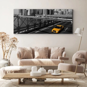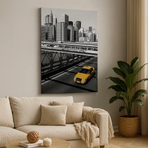 - O vedere alb-negru a orizontului orașului New York, cu un taxi galben pe un pod. Accentul decorativ perfect pentru iubitorii de stil urban și interioare moderne.