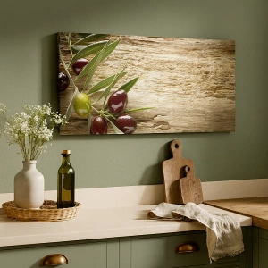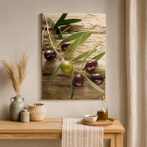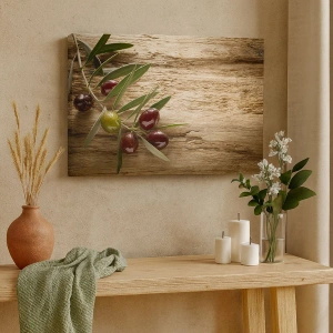Tablou pe pânză Canvas - ramură de măslin cu fructe pe un fundal de lemn învechit - 70x50cm - Direct din natură - Decorațiune modernă pentru perete pentru living și dormitor ARTTOR