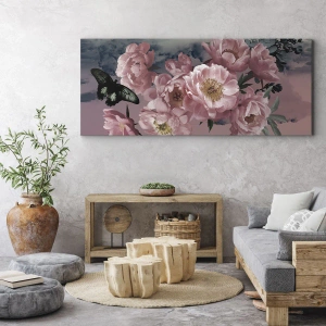 - Acest tablou înfățișează bujori roz înconjurați de frunze delicate, cu un fluture negru pe un fundal în nuanțe pastelate delicate. Un plus perfect pentru interioarele romantice sau clasice, aduce armonie și eleganță oricărui spațiu.
