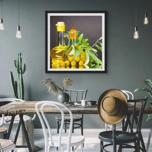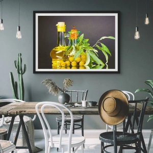 Poster în ramă neagră - Natură moarte cu măsline și ulei - 70x50 cm