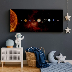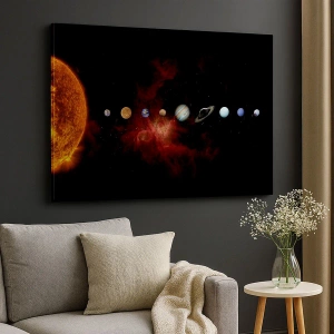 Imprimeul pe pânză „Cartierul Nostru” este o decorațiune fascinantă care surprinde frumusețea și misterul spațiului cosmic. Elementul central este sistemul solar, reprezentând planetele în ordinea lor corectă, întinzându-se pe fundalul spațiului negru și profund. Accentele subtile de culoare roșie adaugă dinamism și energie imaginii.