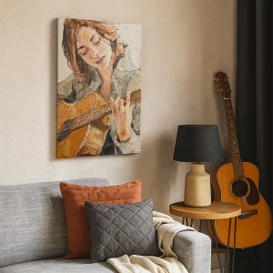 Tablou pe pânză Canvas - Portretul unei fete care cântă la chitară într-un stil pictural, cu culori calde. - 70x50cm - Concert pentru chitară și inima unei fete - Decorațiune modernă pentru perete pentru living și dormitor ARTTOR
