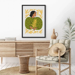 Poster în ramă neagră - Portretul unei femei într-o rochie verde cu o frunză galbenă, cu un model delicat - 50x70cm - Fata hawaiiană - Decorațiune modernă pentru perete pentru living și dormitor ARTTOR