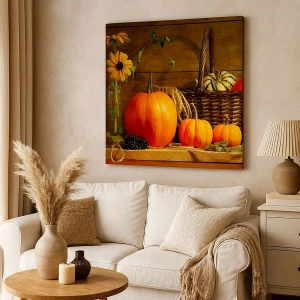 - Acest tablou înfățișează o compoziție de toamnă cu dovleci și flori pe un fundal de lemn. Stilul rustic și culorile calde adaugă confort și armonie oricărui interior.