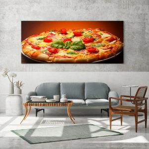 Tabloul „Pizza cu roșii, busuioc și brânză topită” este o compoziție culinară ce atrage privirea prin aspectul său apetisant. Roșiile proaspete, busuiocul aromat și brânza topită creează un întreg armonios, conferind tabloului un caracter unic. Culorile calde și intense conferă interiorului o senzație confortabilă și vă invită la experimente culinare.