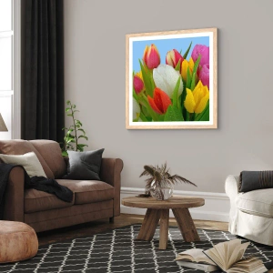 Poster în ramă de stejar deschis - Un curcubeu floral în picături de rouă - 91x61 cm