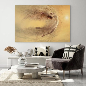 Tablou pe sticlă - O dansatoare într-o compoziție dinamică pe un fundal auriu - 70x50cm - În exaltare de dans - Decorațiune modernă pentru perete pentru living și dormitor ARTTOR