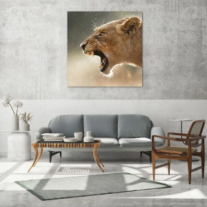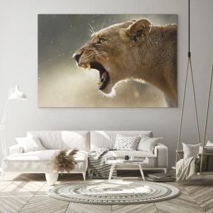 - Această pictură artistică înfățișează un leu răcnind, surprins în razele soarelui. Evidențiază perfect frumusețea naturii și sălbăticia ei, fiind perfectă pentru interioarele moderne.