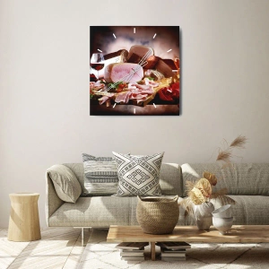 Ceas de perete - Vis culinar cu carafă - Aranjament de mezeluri și carne cu un pahar de vin