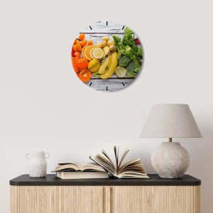 - Acest ceas de perete prezintă un motiv colorat cu fructe și legume pe un fundal de lemn. Perfect pentru bucătării, camere de zi sau sufragerii. Formatul său rotund, de 30x30 cm, adaugă o notă de prospețime oricărui spațiu.