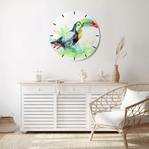 • Acest ceas de perete prezintă un motiv de tucan pe un fundal de frunze tropicale, realizat în acuarelă. Accentele colorate creează un design interior unic.