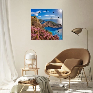 Ceas de perete - Ceas pe sticlă - Vedere a stâncii, a mării albastre și a tufișurilor înflorite într-o zi însorită - 30x30cm - Marea mea vacanță grecească - Decorațiune modernă pentru perete pentru living, bucătărie și dormitor ARTTOR