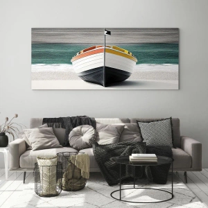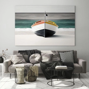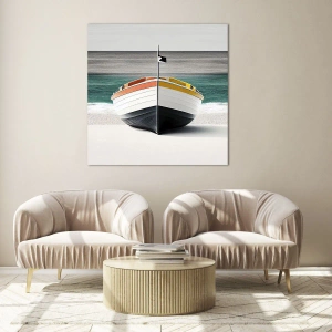 - Pictura înfățișează o barcă colorată, aranjată simetric, pe o plajă luminoasă, cu o mare turcoaz și un orizont calm. Forma minimalistă aduce pace și echilibru spațiului.