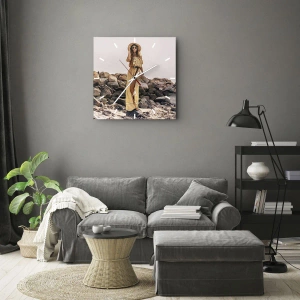 Ceas de perete - Ceas pe sticlă - Femeie elegantă într-o rochie de vară pe un fundal de pietre - 30x30cm - Magia pietrelor - Decorațiune modernă pentru perete pentru living, bucătărie și dormitor ARTTOR