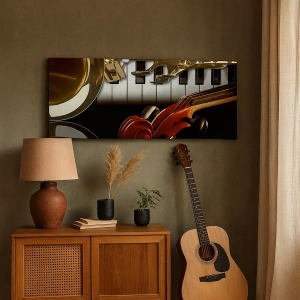 - O compoziție cu instrumente muzicale: un saxofon auriu, clape de pian albe și negre și o vioară roșie. Perfectă pentru interioare dedicate muzicii și artei.