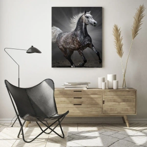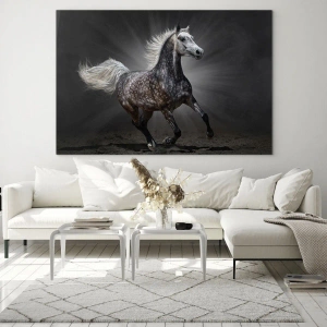 Tablou pe sticlă - Un cal în galop pe un fundal întunecat, cu efect de iluminare. - 70x50cm - Griul elefantin este frumos - Decorațiune modernă pentru perete pentru living și dormitor ARTTOR