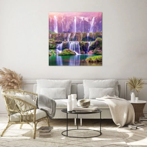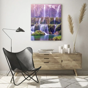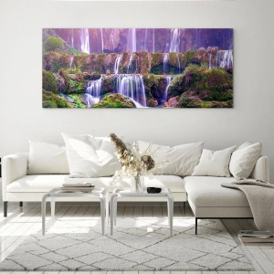 Tablou pe sticlă - Cascade pitorești care curg pe stânci verzi la apus - 70x50cm - Scara către cer - Decorațiune modernă pentru perete pentru living și dormitor ARTTOR