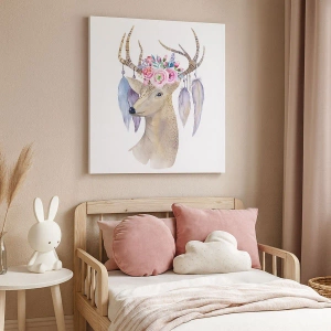 - O delicată grafică cu cerbi, împodobită cu flori pastelate și pene, în stil boho. O decorațiune perfectă pentru interioare romantice, adaugă o notă de lejeritate și rafinament.