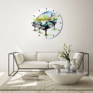 Ceas de perete - Enchanted in Music - Un pian cu un peisaj în fundal, decorat în stil acuarelă