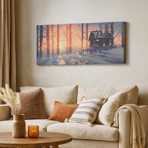- O pictură pe pânză de iarnă care înfățișează o căsuță în pădure în razele soarelui apus. Perfectă pentru interioarele care tânjesc după căldură, liniște și o expresie magică.
