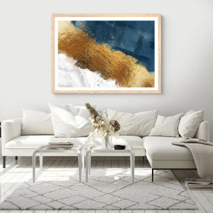 - Un poster modern cu o compoziție abstractă în auriu, bleumarin și alb. Contrastul izbitor de culori și textura elegantă conferă o notă de lux oricărui interior.