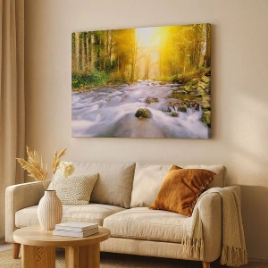 Tablou pe pânză Canvas - Un pârâu de pădure luminat de razele soarelui - 70x50cm - Malachit în rame de argint și aur - Decorațiune modernă pentru perete pentru living și dormitor ARTTOR